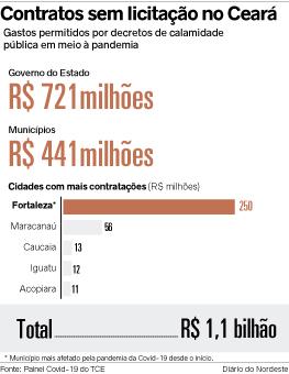 Governo do Estado e prefeituras do Ceará já contrataram sem licitação R$ 1,1 bilhão para o enfrentamento da pandemia de Covid-19. Os dados foram divulgados ontem pelo Tribunal de Contas do Estado (TCE) através do Painel de Dispensas de Licitações Emergenciais e Inexigibilidades relacionadas ao novo coronavírus. Desde o início da pandemia, o Governo Estadual contratou R$ 721 milhões. Os municípios contrataram R$ 441 milhões. Fortaleza, cidade mais atingida pela doença no Estado, formalizou contratos no valor de R$ 250 milhões.